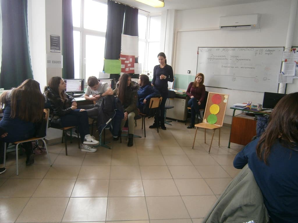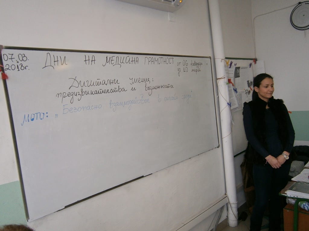 Преподавателите Таня Грозданова и Теодора Некезова проведоха открит урок по Информационни технологии на тема “Дигитални умения: предизвикателства и възможности” с учениците от VIIIБ клас. Те демонстрираха нетрадиционни методи за обучение и усвояване на учебния материал. Откритият урок бе в рамките на Дните на медийната грамотност – от 06.02.2018 г. до 10.03.2018 г.