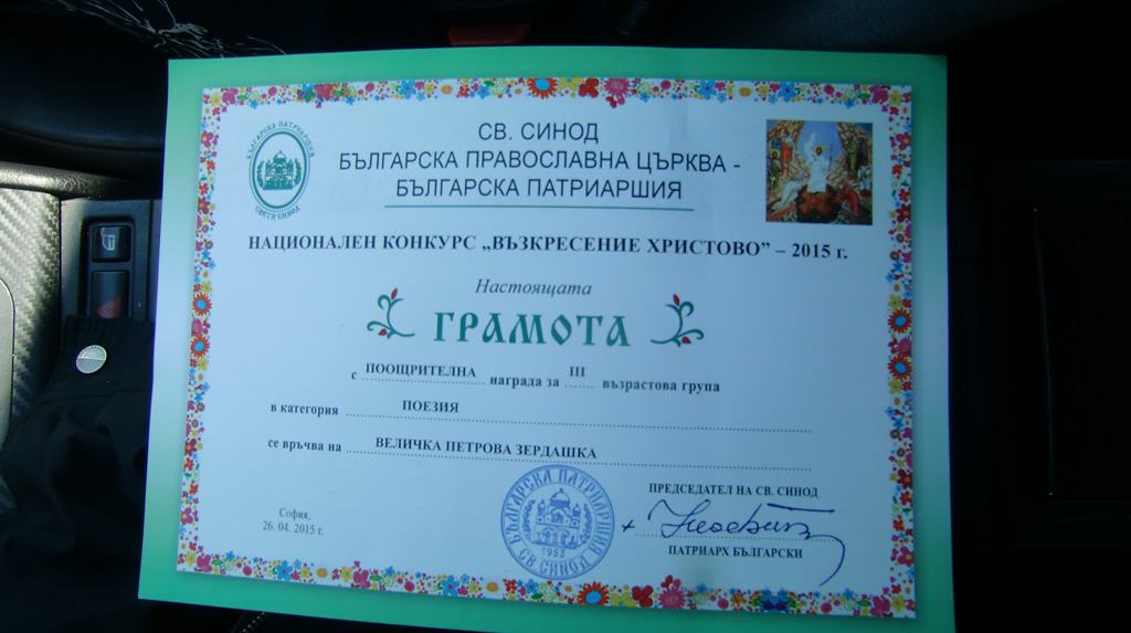 Величка Петрова Зердашка – ученичка от 8б клас на ПГХТТ – гр.Пловдив, с поощрителна награда от Националния конкурс “Възкресение Христово”, обявен от СВ. СИНОД на БЪЛГАРСКАТА ПРАВОСЛАВНА ЦЪРКВА – БЪЛГАРСКА ПАТРИАРШИЯ! Тържествено награждаване от Ловчанския митрополит в Храм “Св. Св. Кирил и Методий”, гр. София.